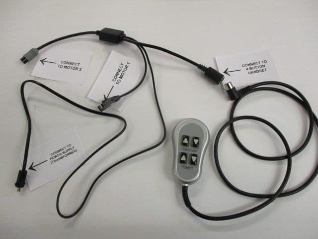 This is a 2 motor contoller system. IMPORTANT - suitable for motors with a single lead only with 1 flat pin and 1 round pin connecting plug. ALSO power supply connection needs to be a single 2 pin plug (1 flat and 1 round) complete with 4 button handset and connecting lead