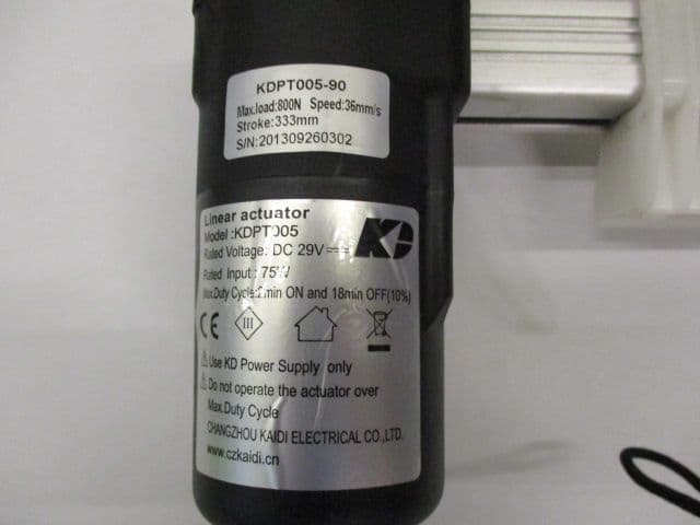 This is a KDPT005-90 Actuator with a 330 stroke. It has 2 leads - 1 5 pin socket for the controller and 1 2 pin plug for the power supply. It fixed by 4 bolts 2 either end. 800N