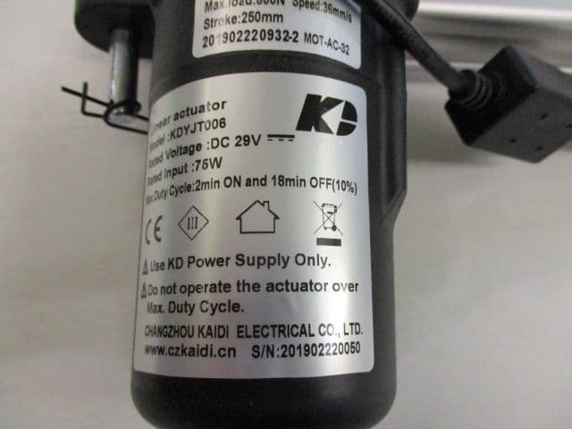 THIS IS AN UNUSED KD ACTUATOR KDYJT006-20. 29V IT HAS A LEAD WITH A 2 PIN PLUG FOR THE POWER SUPPLY AND A 5 PIN SOCKET FOR THE CONTROLLER IT HAS A 250MM STROKE - NOW SUPERCEDED BY THE  KDYJT018-425 29V ACTUATOR 250MM STROKE. This has more reliable components and will be sent in place of the KDYJT006-20 ordered. - (ALSO see KAIDI KDYJT013-02 - suitable replacement if others out of stock)