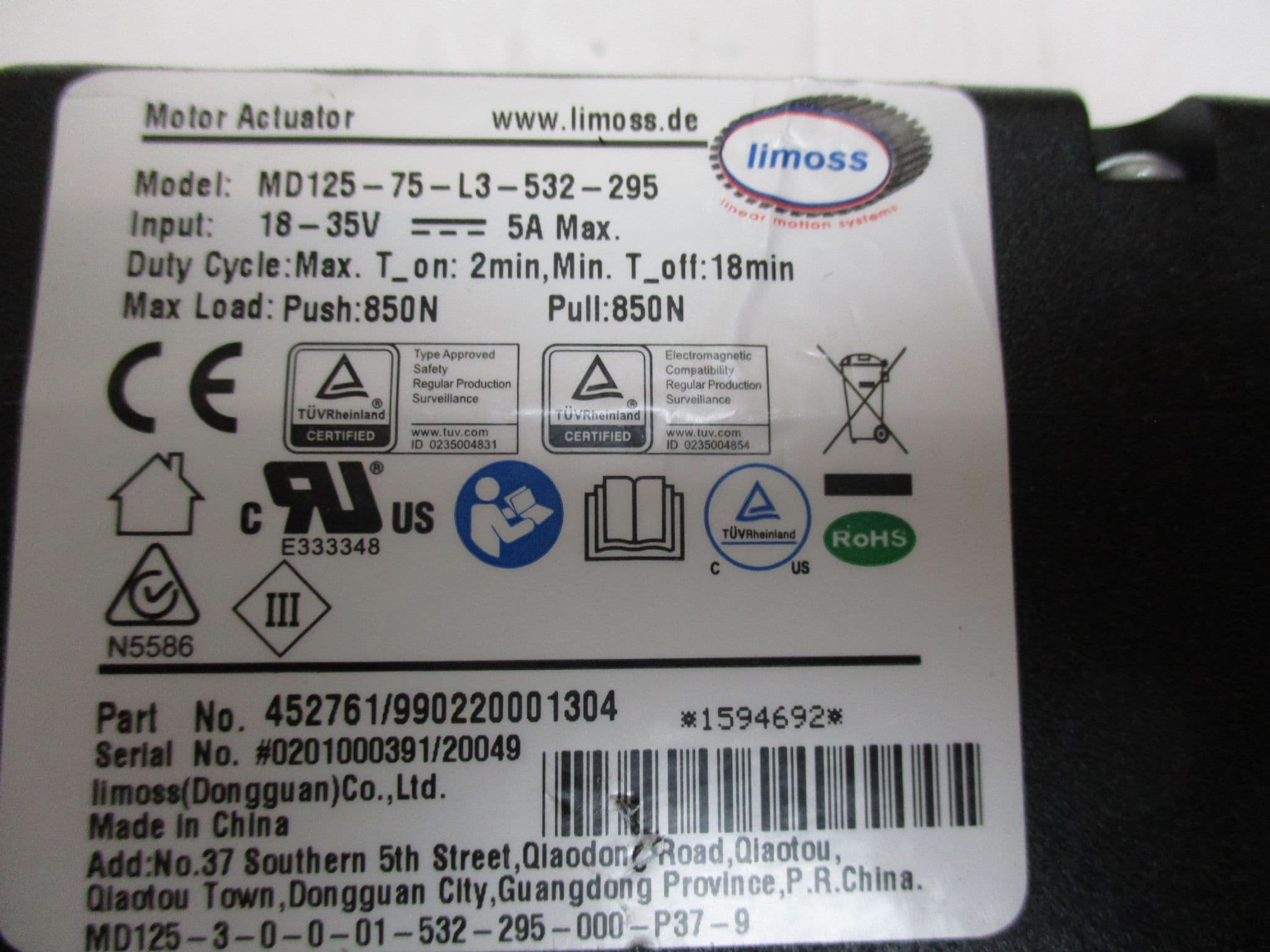 LIMOSS MD125 ACTUATOR 295MM STROKE
